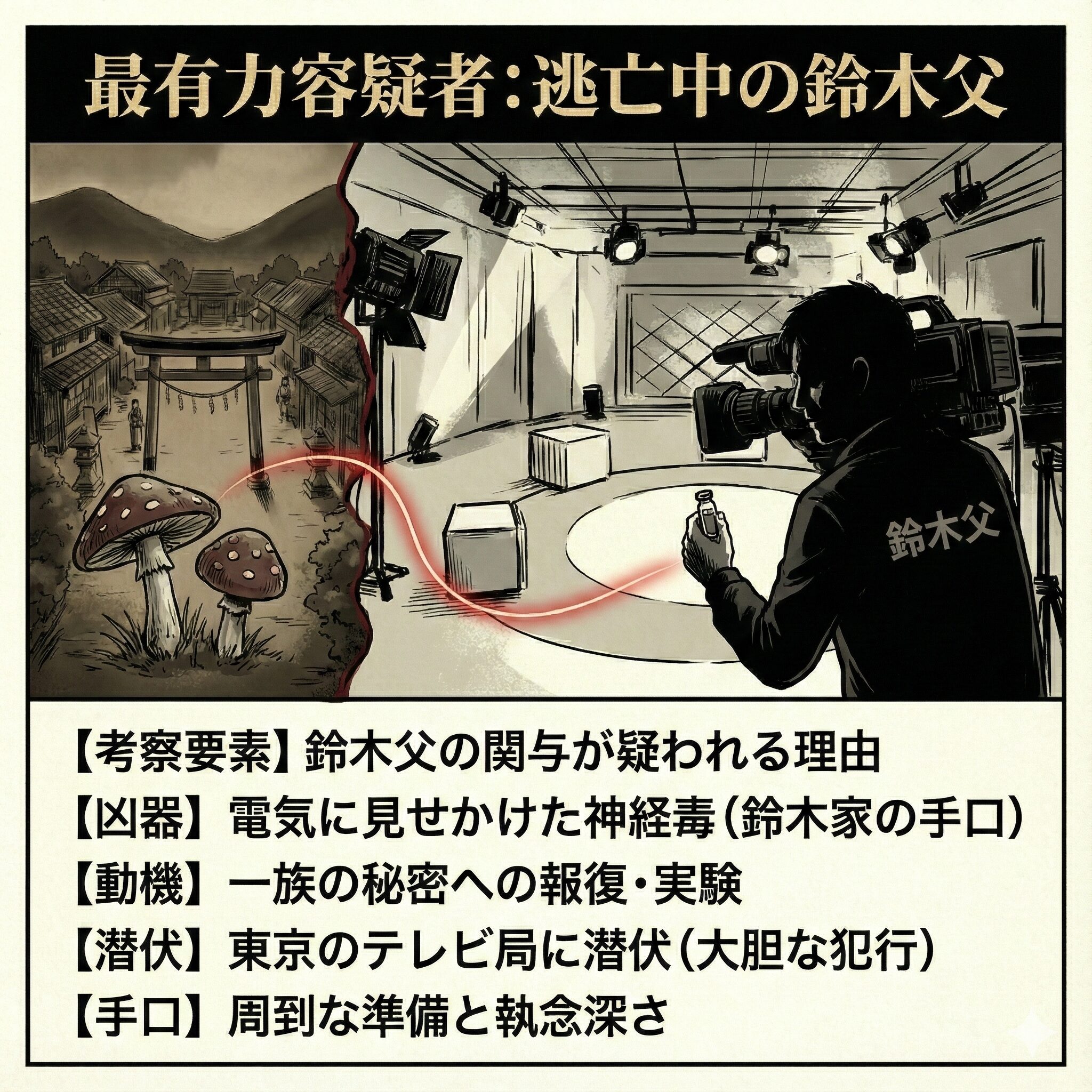| 凶器 | 電気に見せかけた「神経毒」の使用は、薬物に詳しい鈴木家の手口と合致 |