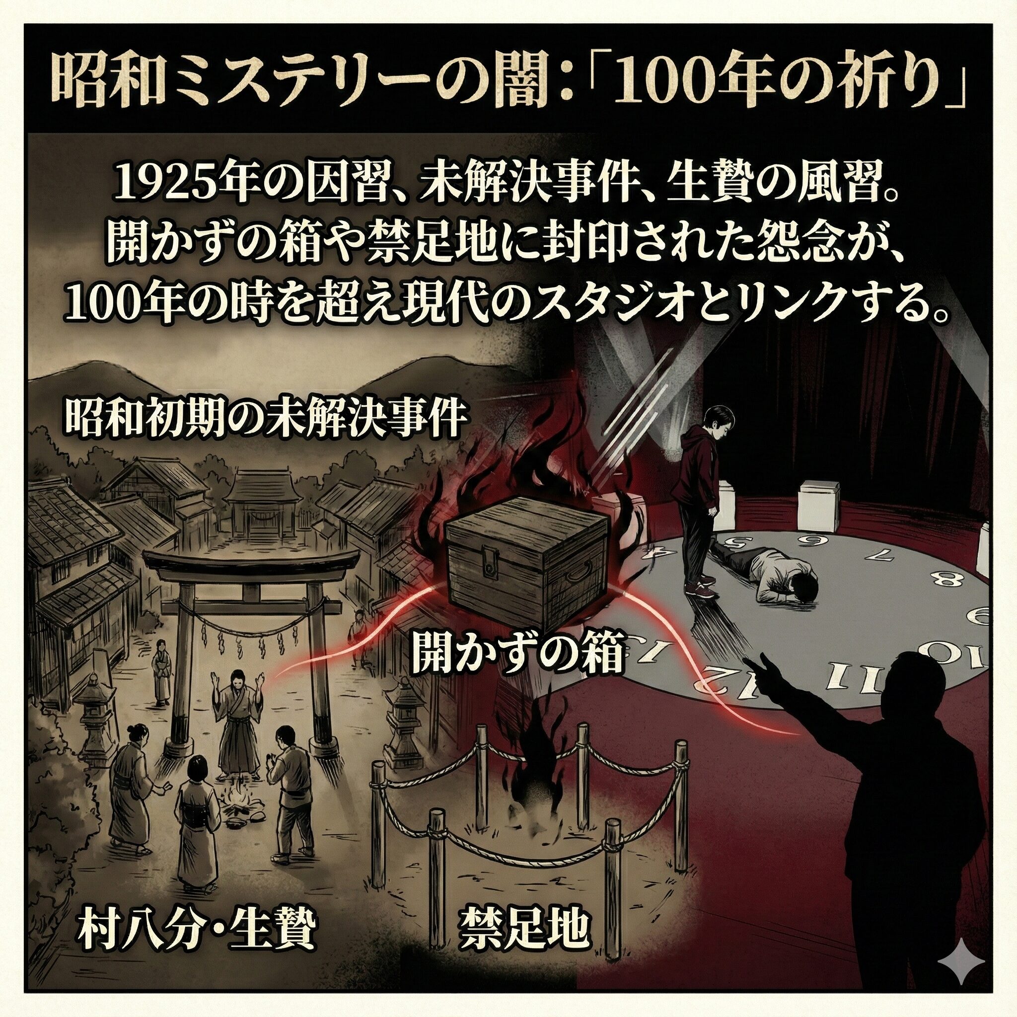 昭和初期に起きたある事件、あるいは村に伝わる悲しい「祈り」が、現代のバラエティ番組の収録現場で起きた事件とリンクしているのではないでしょうか?