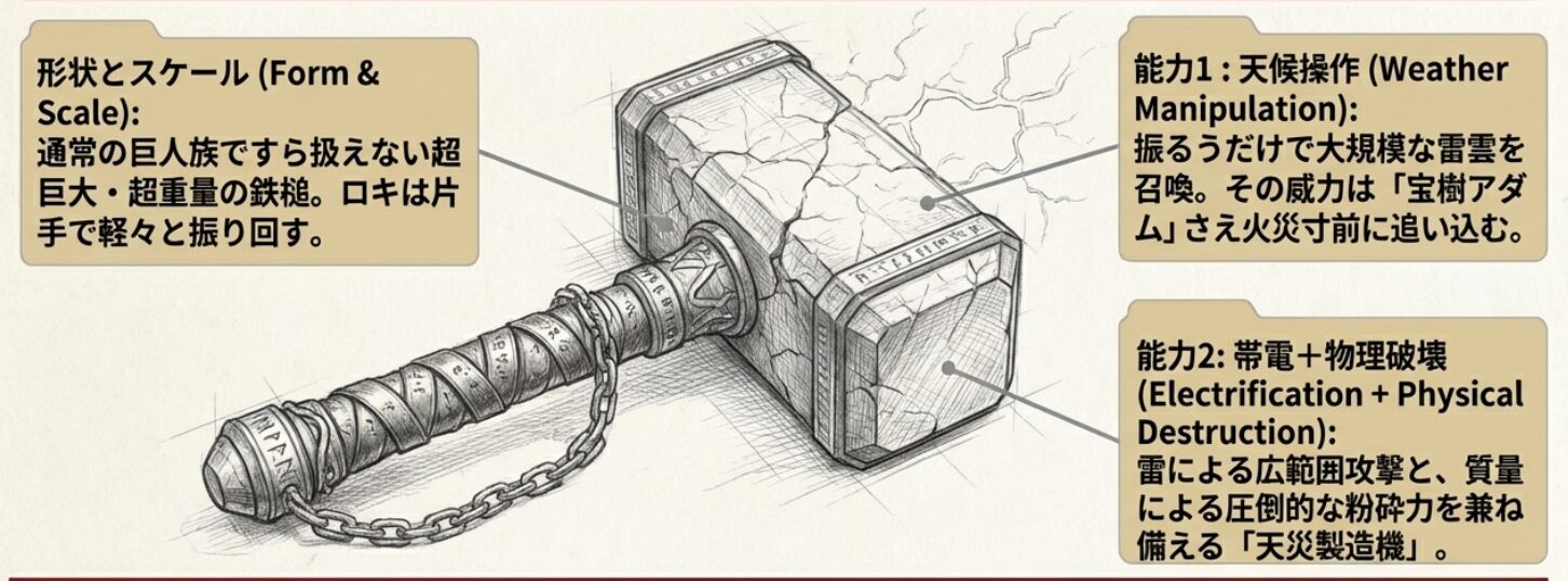 - 形状とスケール ロキ自身の身長も相当なものですが、ラグニルはその背丈の半分ほどもある巨大な鉄塊です。柄が長く、打撃部(ヘッド)は無骨な鉄の塊のようなデザイン。通常の巨人族であっても持ち上げることすら不可能とされる重量を誇ります。 あのハイルディンたちでさえ扱えない代物を、ロキは片手で軽々と振り回しているのです。