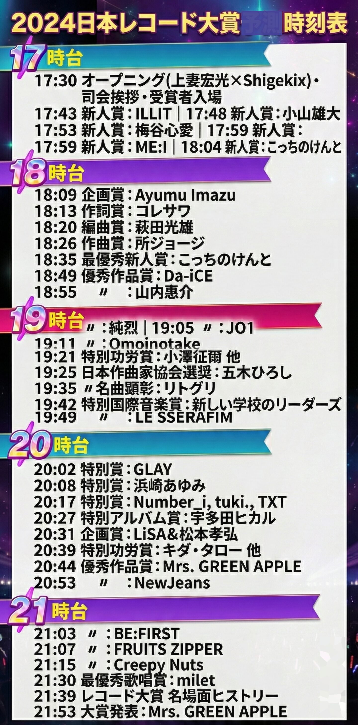 日本レコード大賞タイムテーブル2024【分刻み確定版】出演順番を最速リアルタイム更新!