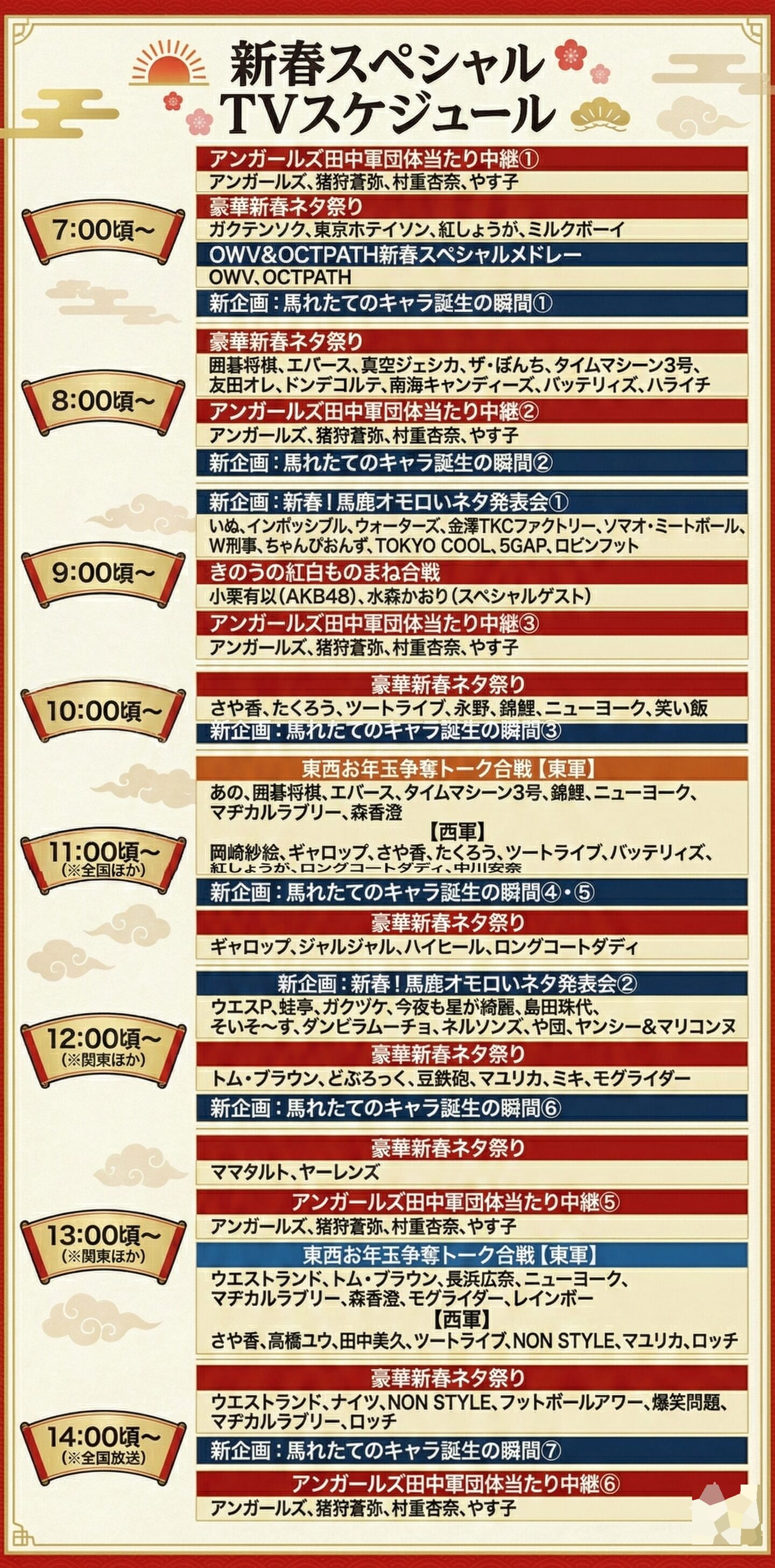 | 8:00頃〜 | 豪華新春ネタ祭り | 囲碁将棋、エバース、真空ジェシカ、ザ・ぼんち、タイムマシーン3号、友田オレ、ドンデコルテ、南海キャンディーズ、バッテリィズ、ハライチ |