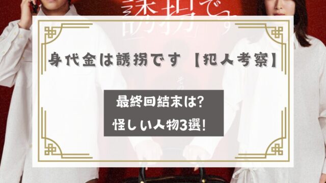 ドラマ『身代金は誘拐です』がいよいよ最終回を迎え、放送直前からSNSや検索では「犯人は誰?」「結末はどうなる?」と考察が一気に盛り上がっています!これまでの伏線や怪しい行動を振り返ると、犯人候補として浮かび上がる人物が何人か存在しており、ど...
